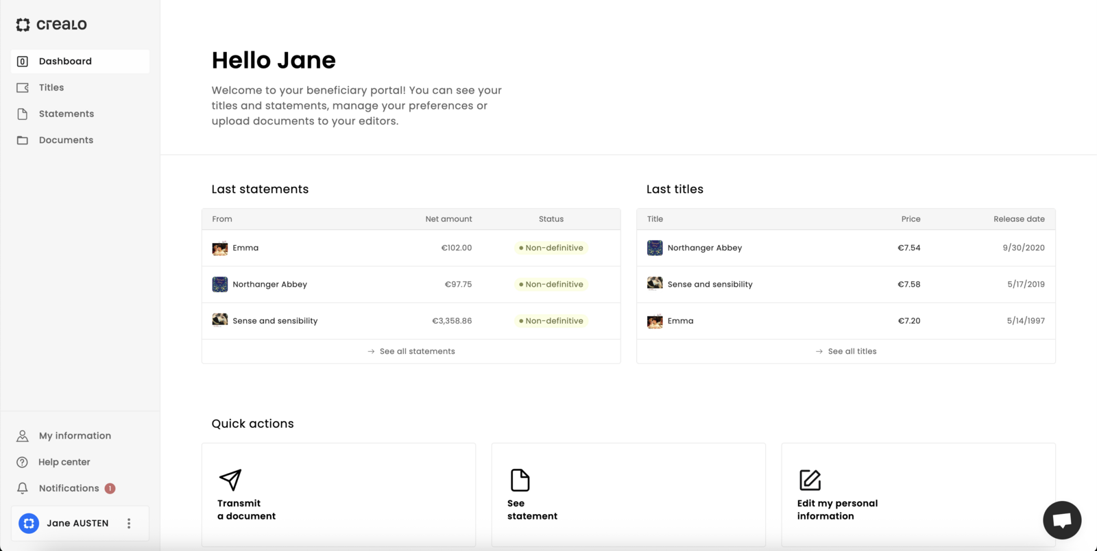 The dashboard gives authors a comprehensive overview of their space, allowing them to view recent statements and titles, and access key actions in one click, such as sending documents, viewing all statements, or updating their personal information.