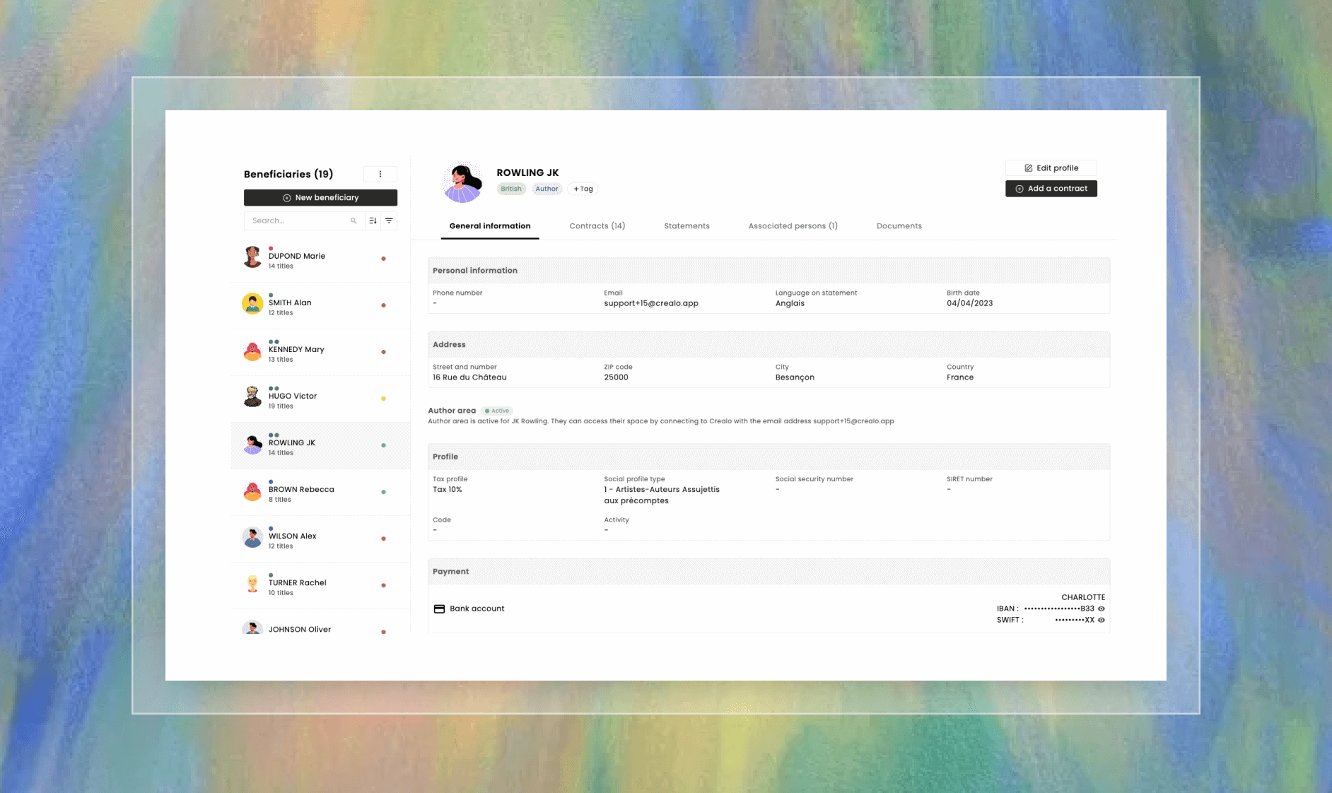 "A complete management of our database: whenever I have new authors to add or need to update a beneficiary’s details, it’s much easier through Crealo than in an Excel file."