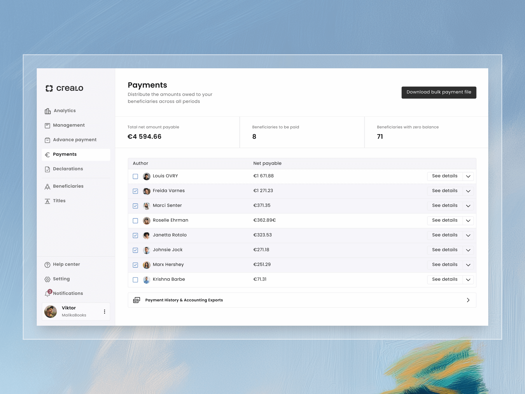 Save time by issuing bulk payments to authors and rightsholders using a bank-compliant transfer file, ready to upload into your payment system.