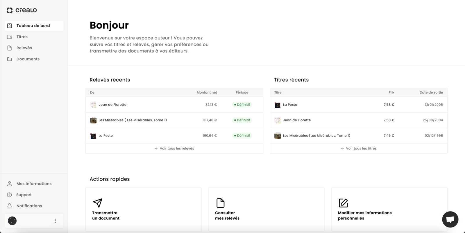 " Nous utilisons particulièrement l’Espace Auteur sur Crealo pour offrir à nos auteurs un accès sécurisé à l’ensemble de leurs relevés. "