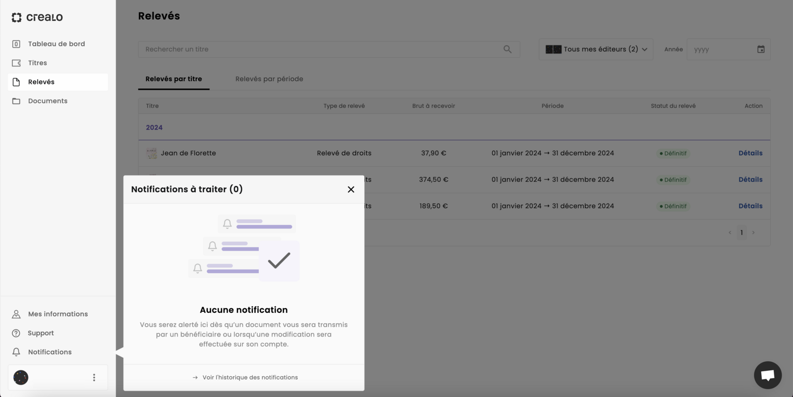 - Consulter leurs relevés et accéder à l’ensemble de leurs relevés de royalties en quelques clics.